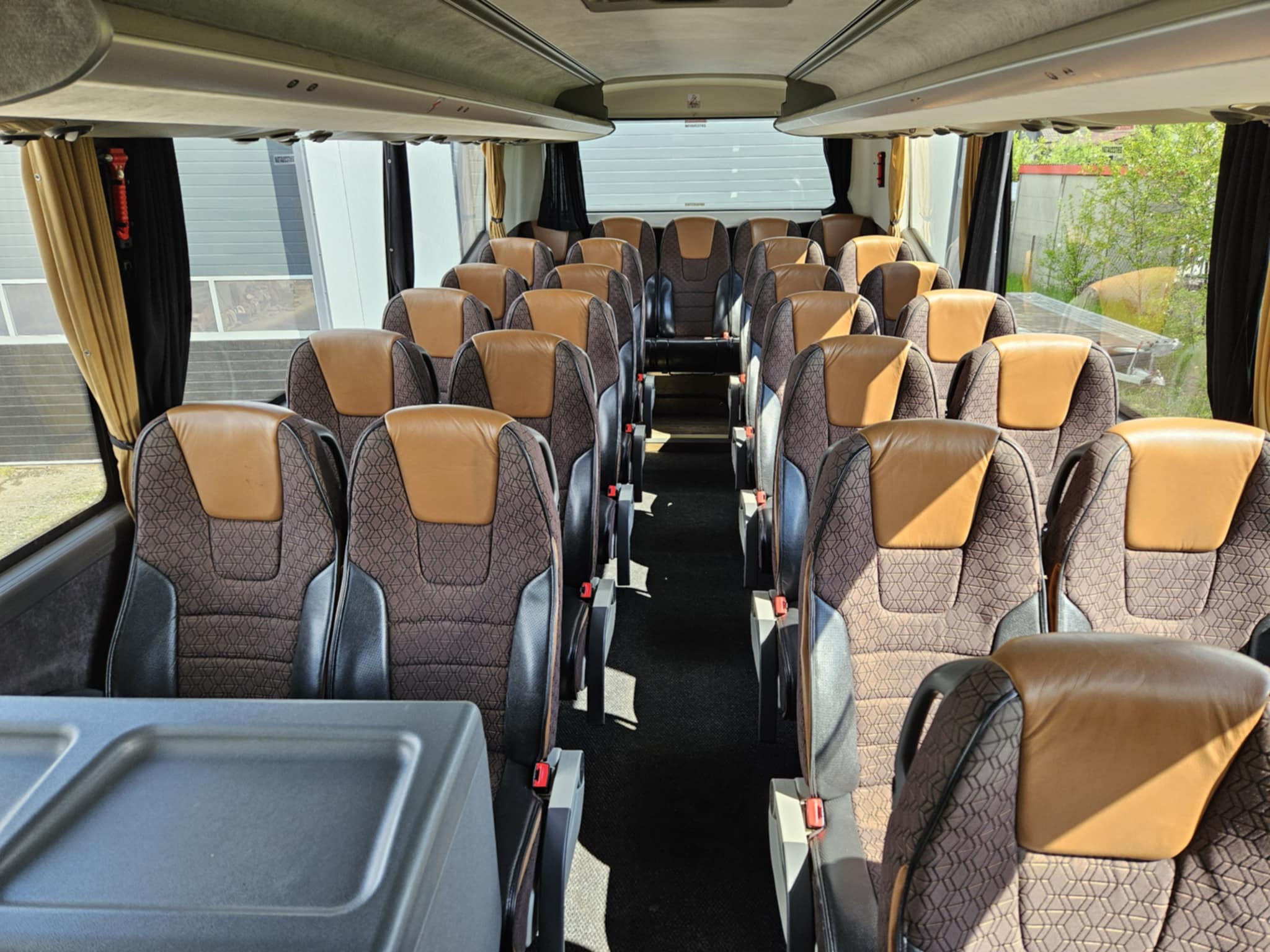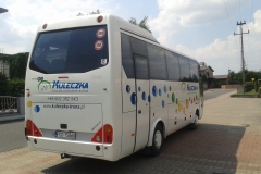 Wyposażenie autokaru: klimatyzacja, TV z tunerem DVBT, DVD z możliwością podłączenia karty pamięci lub pendrive’a, gniazda 230V, Internet bezprzewodowy WiFi na życzenie, odchylane i rozsuwane fotele, przy których znajdują się pasy bezpieczeństwa, podnóżki, siateczki. Na życzenie możliwość wynajęcia wraz z przyczepą.