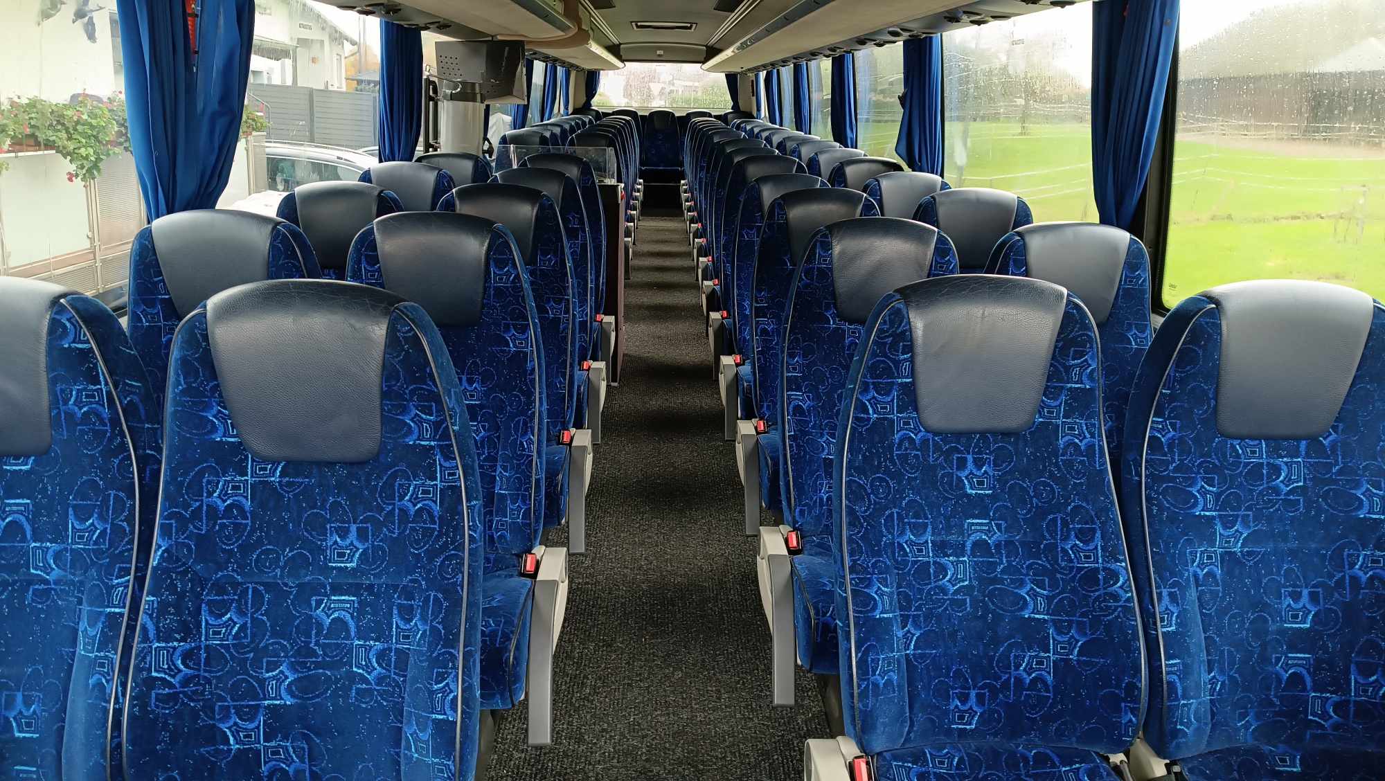 Wyposażenie autokaru: klimatyzacja, toaleta, caffebar, lodówka, 2x TV, DVD z możliwością podłączenia karty pamięci lub pendrive’a, gniazdo 230V, Internet bezprzewodowy WiFi, odchylane fotele, przy których znajdują się pasy bezpieczeństwa, podnóżki, siateczki oraz stoliczki,